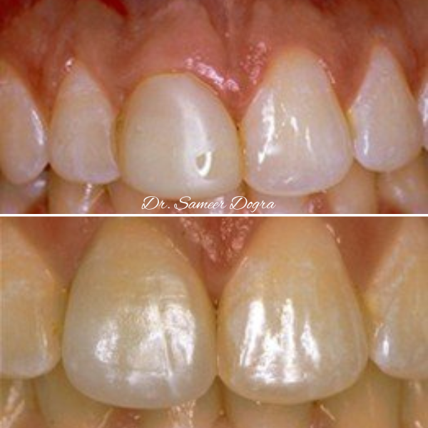 Front (left) Central Tooth has a poor restoration. Does not look natural and is not contoured properly to match the gumline of the rest of the teeth.